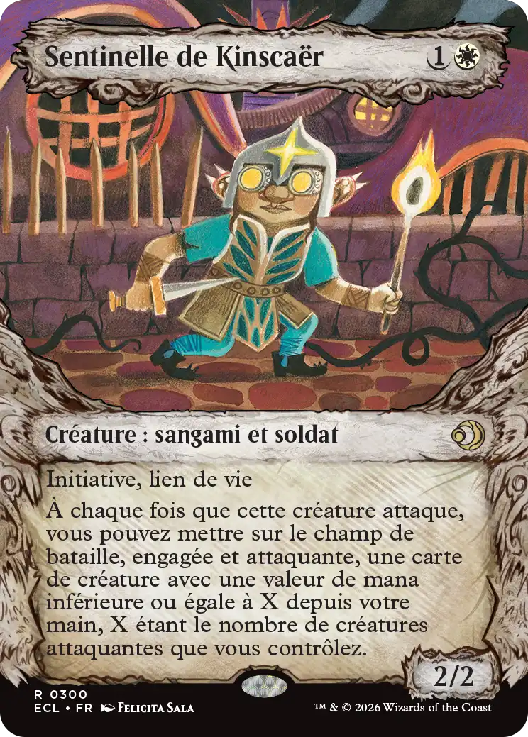 À chaque fois que cette créature attaque, vous pouvez mettre sur le champ de bataille, engagée et attaquante, une carte de créature avec une valeur de mana inférieure ou égale à X depuis votre main, X étant le nombre de créatures attaquantes que vous contrôlez.
