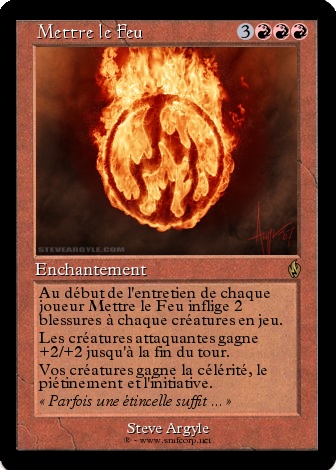 Je vous présente aujourd'hui un enchantement typiquement rouge ; un enchantement bien bourrin comme on a l'habitude en rouge non sans sacrifice ... je refais mes deck en ce moment et je viens de faire un gros deck aggro rouge avec chatdefeu incandescent boule fulgurante et pandémonium et aussi autodafé des livres rudoiement brûlecrane et chevaucheur d'avalanche et champion kelde ... je me suis dit ce serai bien un enchantement qui mette un peu le feu avec tout ça ! quelques heures de boulot plutard je vous présente donc cette carte !!! je mis un coup assez élevé vu que sont arrivé sur le champs de bataille peut vraiment engendrer un certains désordre ... dites moi ce que vous en pensez ... je prends note de toute critique constructive ...