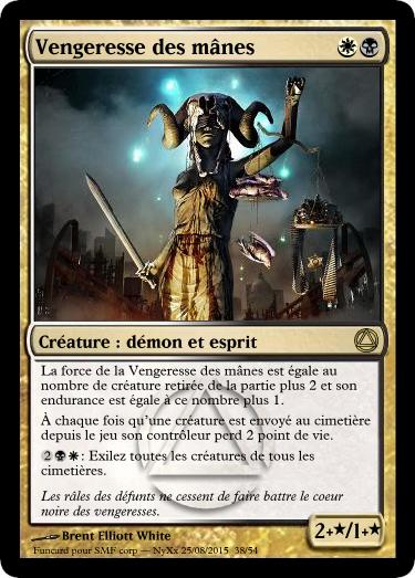 - Pour les capacités je voulais essayer de transcrire l'idée de vengance des âmes à travers magic, j'ai pensé donc à une sorte de punition envers le joueur qui laisse mourrir ses propres créatures, l'effet pouvant également se retourner contre le propriétaire de la Vengeresse.