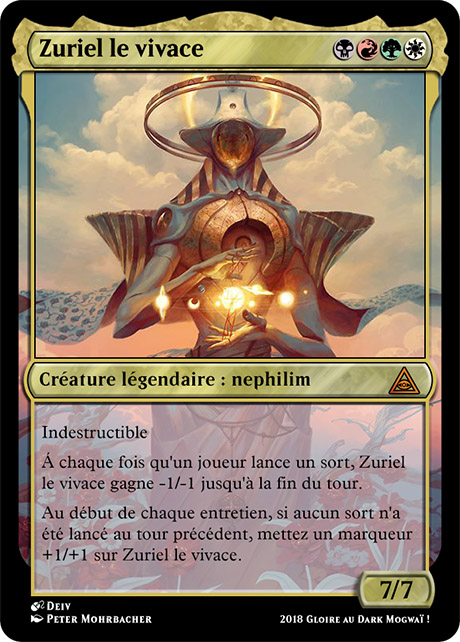 par le biais des loups-garous, et fait sens en anti-bleu. Maintenant, ta carte en tant que Ruhan des Fomori indestructible... Pourquoi pas. Le seul petit bémol que j'émettrais est le fait que sa capacité le tue extrêmement difficilement (7 sorts, ça fait beaucoup) et qu'en attaque, elle sera très souvent entre 5/5 et 7/7.