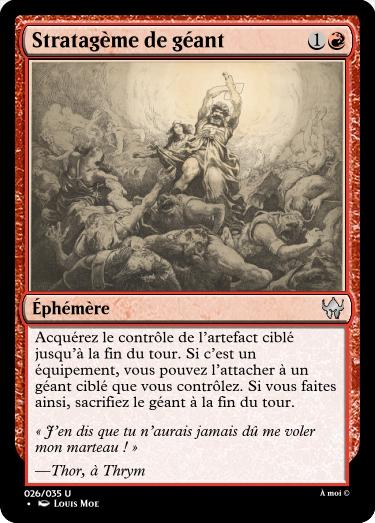 Cette carte permet donc un vol temporaire d'artefact, mais se voit plus intéressant dans l'optique d'un deck tribal et d'un vol d'équipement. Avant, il fallait contrôler un géant, mais j'ai retiré cette clause ; peut-être même devrais-je retirer le fait que ce soit un géant et l'attacher à une créature quel que soit son sous-type. Qu'en pensez-vous ?