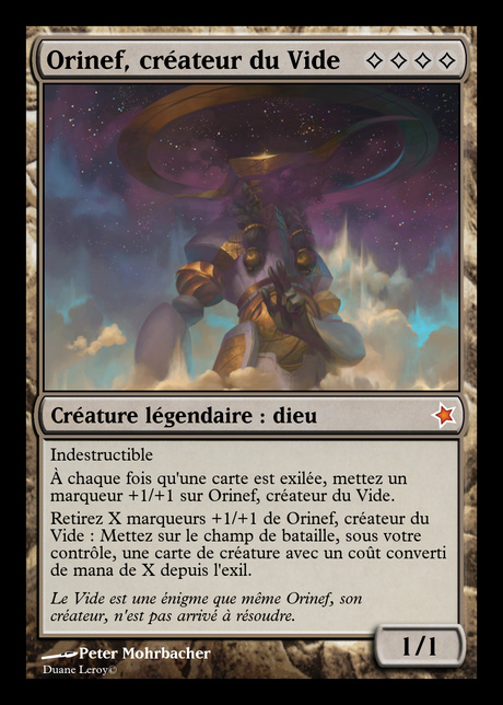 Ayant déjà vu l'apparence que prenait ton funset, avec notamment la faction du vide, je trouve ce dieu assez intéressant. Cependant, là où les autres sont souvent trop faibles car trop situationnels, celui-ci est trop fort, quoique pas tant parce que sa capacité est assez large. Le fait est que, comme tu comptes individuellement chaque carte, il te suffit d'exiler les dix cartes du cimetière d'un adversaire pour lui mettre dix marqueurs. En plus, il fait quelque chose que l'on n'est pas censés faire normalement, à savoir ramener des cartes depuis l'exil de manière non conditionnelle, ce que je lui pardonne, pour cette fois. Mais le fait de mettre tant de marqueurs sur cette carte au moindre exil du cimetière la renforce grandement, et peut-être trop... A moins que l'adversaire n'ait un Chemin vers l'exil, preuve irréfutable de la vérité du texte d'ambiance : sa création l'a dépassé.