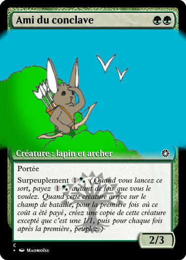 Même si j'aime bien l'idée de Khos, j'ai voulu faire ma propre variante de la progéniture. Voici l'engendrement, une capacité qui permet de mettre des cartes de créature sur le champ de bataille pour un coût peu élevé en tant que 1/1. Une sorte de fausse convocation. Le problème, c'est que certaines créatures, même en 1/1 peuvent être assez forte avec leurs capacités. Il faut donc faire attention au type de créature à qui on la donne (Les blaireaux ça va. En général ils ont pas des capacité délirantes.)