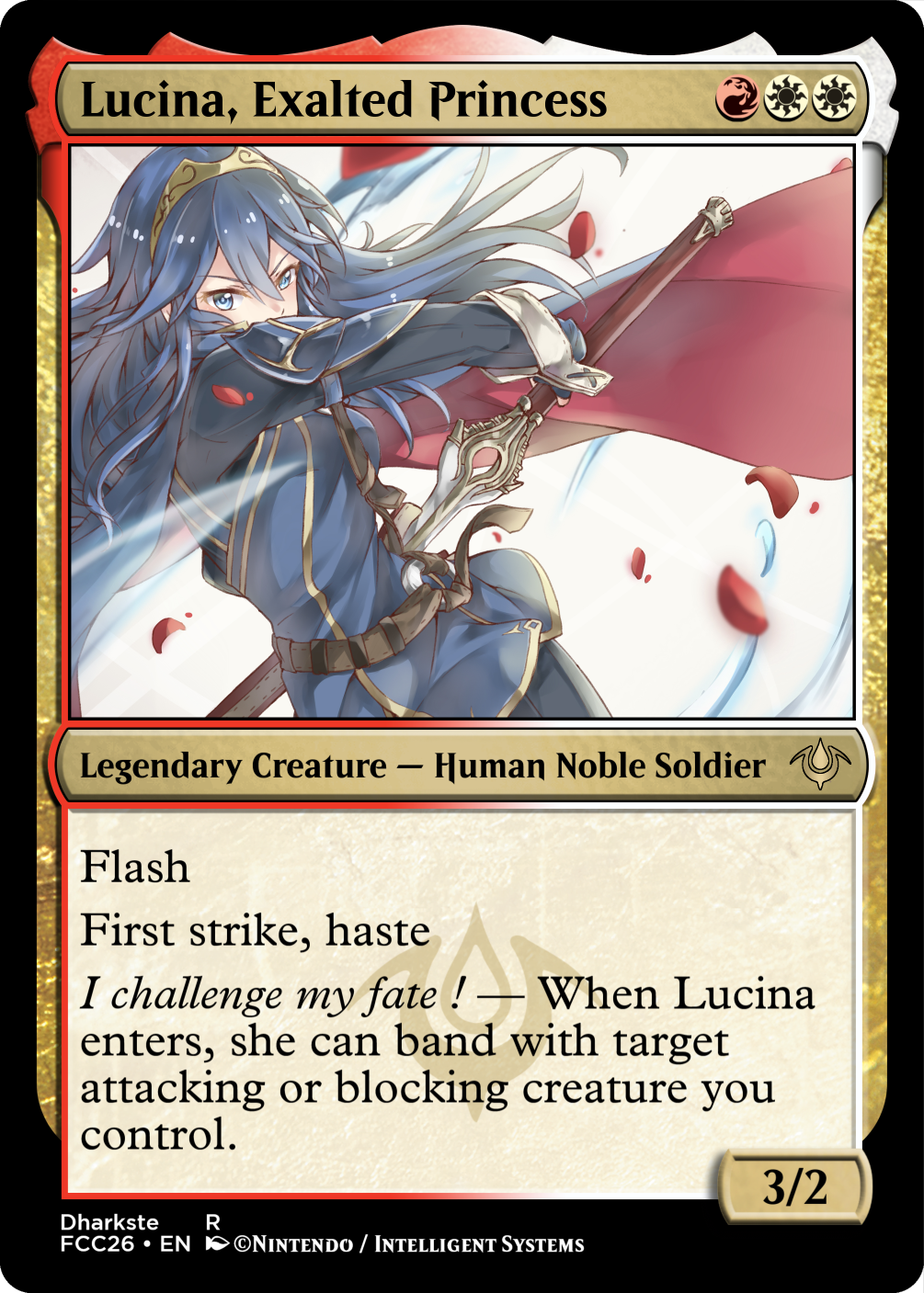 Lucina est un personnage vraiment intéressant, agile et létal. Dans sa ligne temporelle, le méchant a gagné et tué tout le monde. Elle a pu remonter le temps pour essayer de changer, dans la nouvelle ligne temporelle, les évènements qui ont mené à la mort de son père et à la victoire du méchant. Elle va donc régulièrement d'interposer de nulle part pour sauver de la mort certains personnages clés. C'est ce que représente sa capacité spéciale, pour laquelle je ressors opportunément le mot clé « banding » qui me permet d'illustrer cette propension à se ruer au secours d'un combattant (et le banding fait écho au système de duo dans le jeu qui permet à deux unités de « fusionner » avec l'un qui assiste l'autre, donc ça tombe bien).