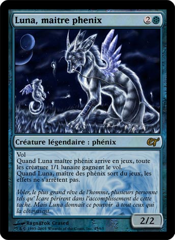 "Les créatures lunaires avec une force et une endurance egale à 1 ont le vol, cet effet ne s'arrète pas quand Luna, maître phénix quitte le jeu."