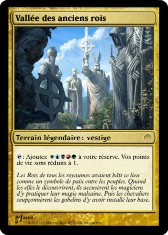 Depuis longtemps j'avais ce projet qui me trottait dans la tête : mais non, je n'avais bel et bien jamais vu de terrain qui fournisse les cinq couleurs à la fois... En général, c'est un mana de la couleur que l'on veut, mais ici c'est quand même plus claquant : je sais pas moi, si vous jouez des atogs ou des slivo par exemple...
