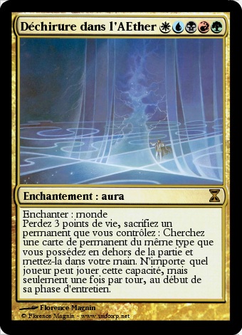 J'ai fait une carte dorée parce que c'est plus joli, et aussi parce que, en termes de storyline, je voulais faire quelque chose qui nécessite de contrôler les 5 couleurs de magie à la fois, façon Urza l'Arpenteur des Plans. Normal, puisque ce puissant sort permet quand même d'ouvrir une déchirure dans l'AEther qui sépare les mondes et d'aller chercher ce qu'on veut ailleurs dans le multivers.