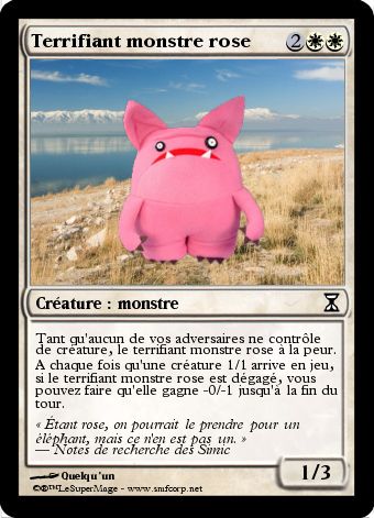 La description de la carte, vite fait : il ne fait peur à personne, d'où sa première capacité, sauf aux petits (et encore...) d'où sa deuxième capacité qui lui permet de les effrayer quand ils arrivent en jeu.
