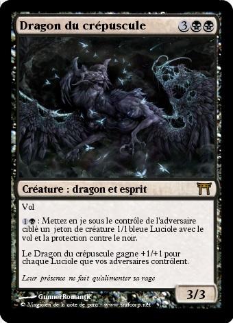Pour l'autre capa, j'ai eu du mal à trouver: je ne savais pas si les lucioles étaient là pour accompagner le dragon (un peu du genre Kami des champs du palais, ce qui explique un peu aussi le type de ma créa et le symbole d'édition) ou si elles venaient le taquiner. Je me suis alors inspiré de la 2e idée et des créatures au rabais (nom stupide au passage) de ravnica. Sauf que j'avais envie de faire quelque chose de différent: comme la grosse bestiole de l'image n'a pas l'air contente que les lucioles lui tournent autour, je me suis dit que je pourrais booster mon dragon en échange d'une luciole pour l'adversaire. J'aurais pu faire "mettez un jeton......, mettez un marqueur +1/+1 sur le dragon du crépuscule" mais on a qu'à dire que sa rage s'estompe lorque les lucioles sont parties. Protection bleu pour les lucioles car les dragons n'a pas trop l'air de les gèner. (pour ceux qui ont vu ma 1ere FC, vous remarquerez que j'aime bien avantager mon adversaire)