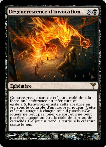 Capacité: Alors, j'ai essayé de trouver le meilleur moyen pour dire que la créature échappait à tout contrôle, et qu'elle était désormais indépendante (d'où l'intervention d'un joueur supplémentaire).Ensuite, elle attaque à chaque tour, car elle est fâchée, et puis sinon ça bloque le reste.