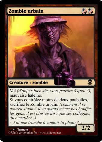 Ensuite, j'ai voulu rajouter la Mauvaise haleine, pour donner une utilité aux dents qu'il nous montre sur l'illustration. Un truc WotCien pour la mauvaise haleine ? "Chaque fois qu'une créature bloque le Zombie urbain, elle gagne -0/-1 jusqu'à la fin du tour." (elle est destabilisée un instant par la bonne odeur de notre zombie).