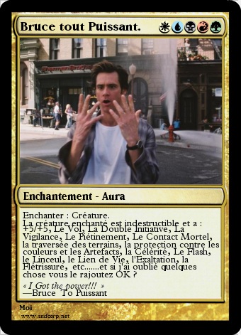 Voila tout est dit, votre créature est comme Bruce tout puissant. Je voulais faire une carte mais avec que des capacité pourri genre (gagne+0/+1, le regroupement avec les srânes, la protection contre les Homarides, le flash, le recyclage 3, l'évanescence 1, la suspension 100 -