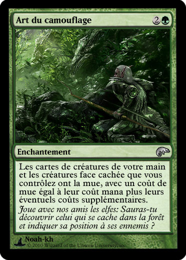 Très bonne idée de carte, cependant il y a quelques erreurs. D'une, il manque "de" pour "cout de mana". Ensuite, il manque un espace après "elfes" dans le texte d'ambiance. Pour finir, le texte de la carte me semble trop imposant, il aurait été judicieux de réduire la taille pour avoir un texte plus aéré.