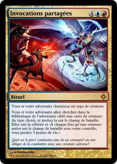 Nom : Invocation partagées, enfaite, c'est a double sens, l'adversaire et vous invoqués une créature chacun et c'est pas une créature qui vous apartien mais qui apartien a l'adversaire...