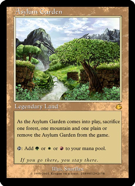 Lorsque le Jardin d'Asile arrive en jeu, sacrifiez une forêt, une montagne et une plaine ou retirez le Jardin d'Asile de la partie.