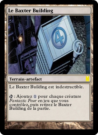 Salut. Alors effet interessant même s'il n'y à pas lieu de mettre de l'italique pour fantastic four. Le SE est horrible et on y voit du blanc, pas de pinceau d'illustration, le symbole d'engagement n'est pas approprié au type de carte. Il t'aurais fallu le nouveau symbole ou mettre ta carte en Old Style pour garder ce symbole. L'hestétique n'est pas au rendez vous, tu aurais pu au moins sauter une ligne avant de mettre le Baxter Builging est inestructible. Et un TA n'aurait pas été de refus car tu laisse de la place vide...