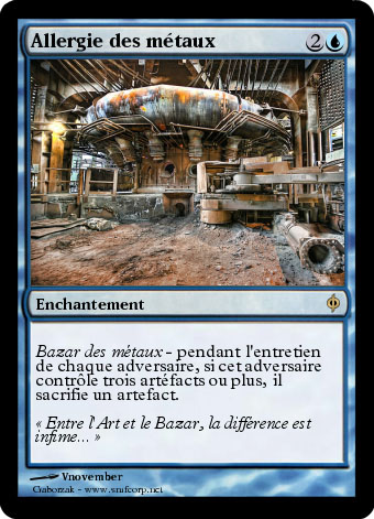J'ai donc crée une nouvelle capa, que j'ai nommé "Bazar des métaux" histoire de parodier l'existante (j'avais pensé aussi à "Mitard des métaux"...). Elle fonctionne à l'inverse de l'art des métaux, c'est à dire qu'elle se déclenche quand l'adversaire contrôle 3 artéfacts ou plus. Bon, à première vue c'est très limité en utilité, peut être en side. Mais imaginons que l'on joue avec la Treille de mycosynthèse, là l'adversaire ne rigole plus car il va devoir sacrifier un permanent tous les tours!