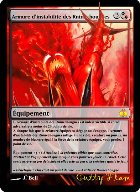 Après l'effet, "à chaque fois que la créature équipée s'engage ou se dégage". Donc en gros, souvent, elle inflige à une cible, créature ou joueur un nombre de blessure égal à la force de la créature équipée. Et pour contrebalancer, on perd 1 hp à chaque fois que la capa s'active, donc faire attention parce qu'en fonction de la créature équipée ça peut aller très vite !