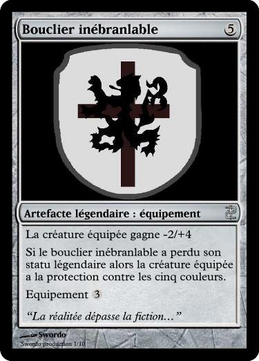 Deuxieme capa ecrit plutot "tant que le bouclier inebranlable n'est pas légendaire, la créature équipée a la protection contre toutes les couleurs."