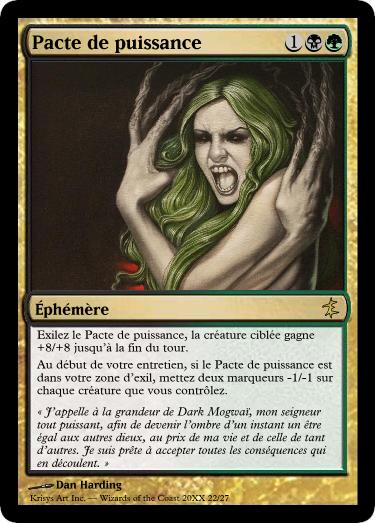 - ou bien, pour éviter que les effets négatifs des Pactes puissent être contournés, tu peux commencer chaque Pacte par « Exilez le Pacte de ~ .» et faire que les effets négatifs ne marchent que quand il est exilé. (Ce qui évite également de subir les effets négatifs sans le lancer (Meule , etc.), en se le faisant Contrecarrer (sauf peur-être par dissipation), etc.)