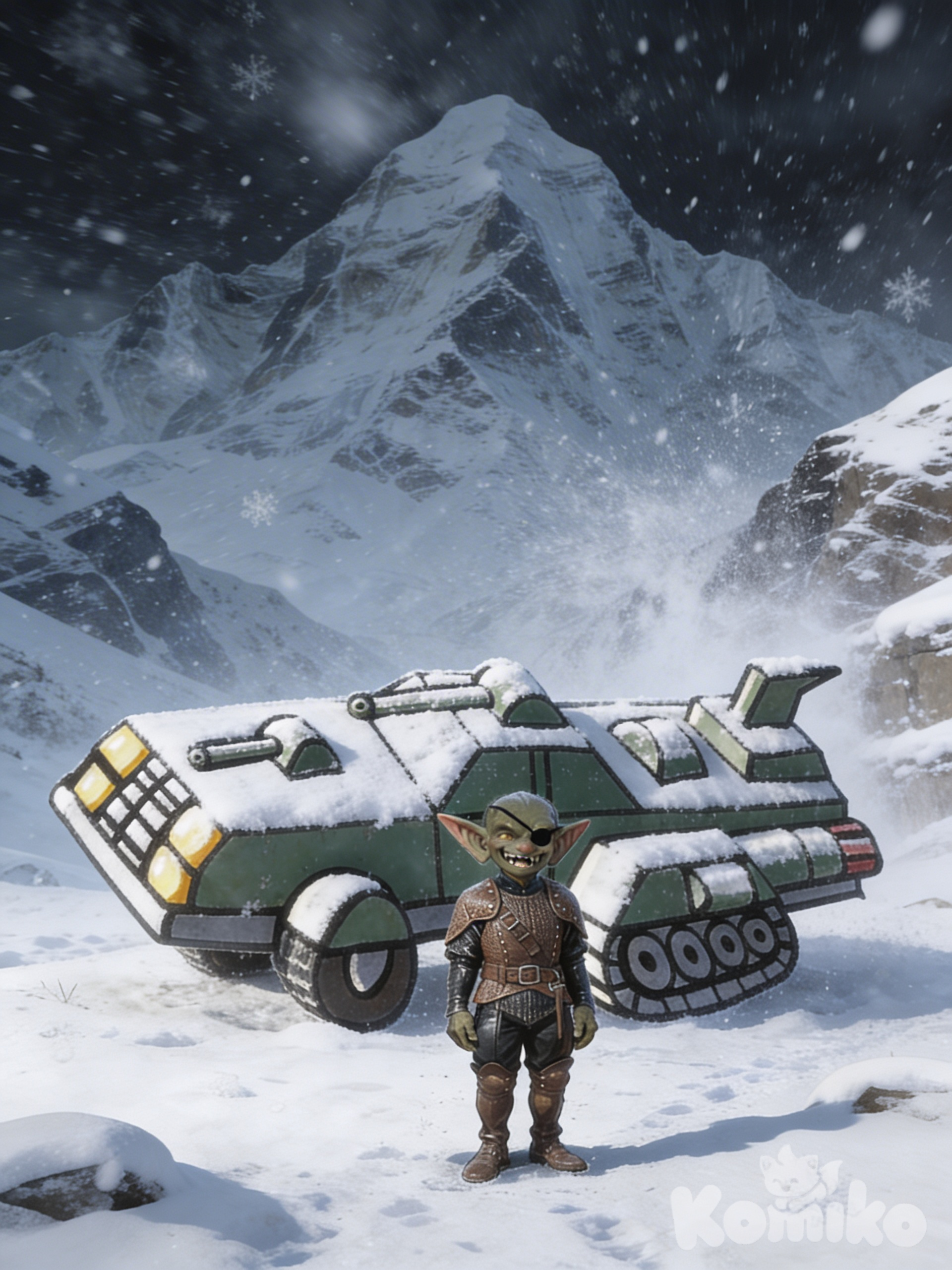 Enfin, j'ai demandé à l'IA "ajouter de la neige sur le tank et le gobelin.